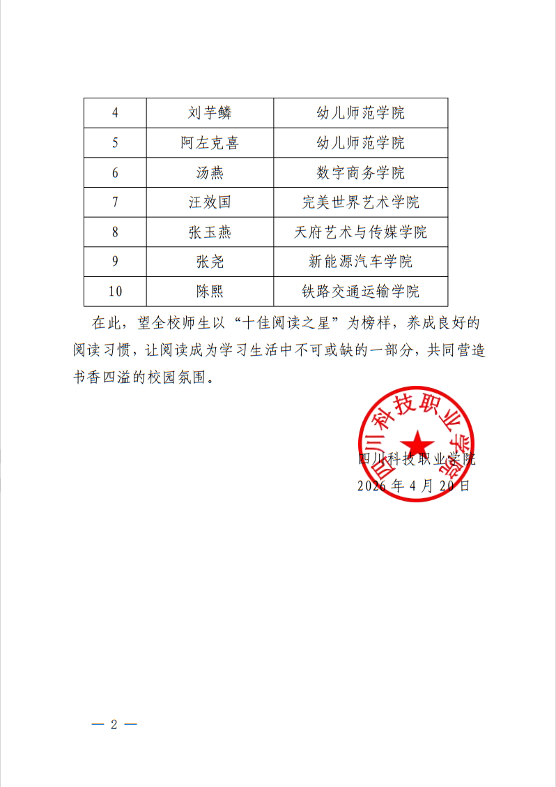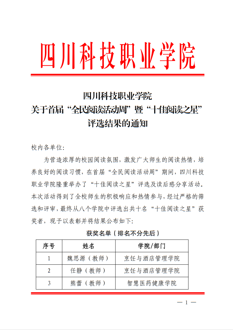 四川科技职业学院 关于首届“全民阅读活动周”暨“十佳阅读之星” 评选结果的通知